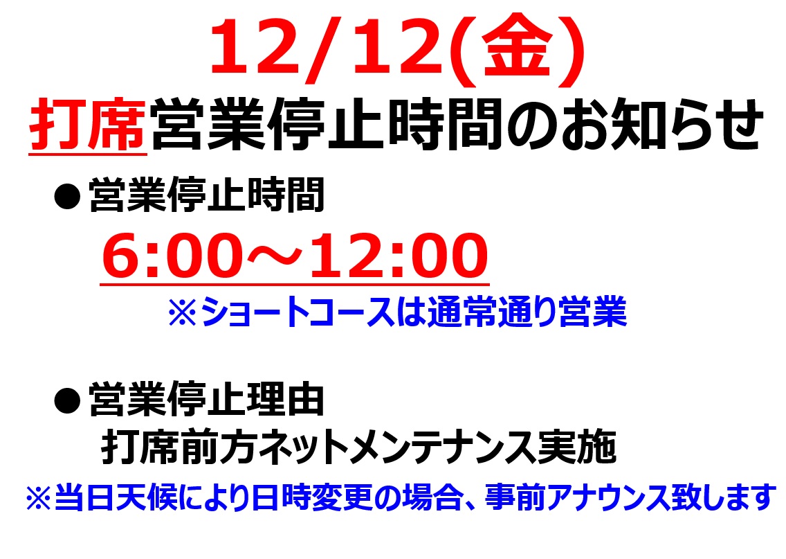 > 12月12日(金) 「打席 営業停止 」のお知らせ。